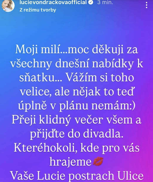 Pre obdivovateľov Lucie Vondráčkovej (45) sa po jej rozchode s mladým zápasníkom Zdeňkom Polívkom (27) otvorila nová šanca na získanie si priazne tejto sympatickej českej hviezdy. A zjavne niektorí neváhali, dokonca už dostala viacero ponúk na sobáš, ako vyplýva z jej najnovšieho príspevku na Instagrame.