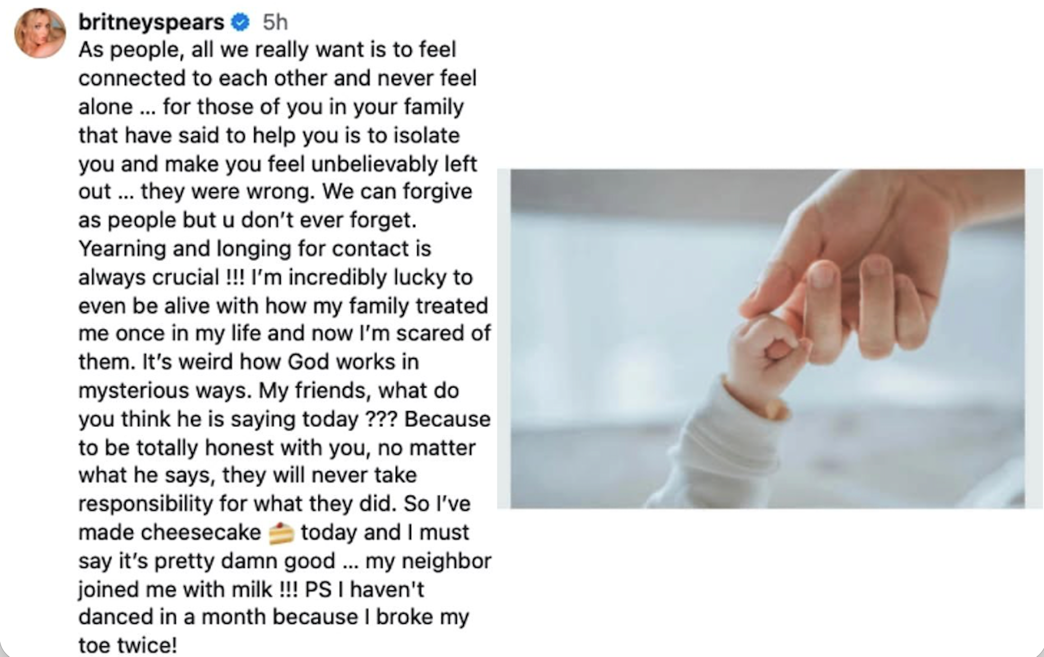 Britney sa fanúšikom zverila pod emotívnou fotografiou dieťaťa držiaceho prst dospelého. K záberu pripojila dlhý text: „Ako ľudia chceme len cítiť vzájomné spojenie a nikdy sa necítiť osamelí...“ a dodala: „Ako ľudia vieme odpúšťať, ale nikdy nezabúdame.“ Následne šokovala vetou: „Som nesmierne šťastná, že vôbec žijem, keď zvážim, ako sa ku mne moja rodina raz v živote správala, a teraz sa ich bojím.“ Speváčka pripomenula aj pretrvávajúci spor so svojím otcom Jamiem, matkou Lynne a sestrou Jamie Lynn a položila otázku: „Čo si myslíte, že dnes hovorí?“ Na záver odkázala: „Aby som bola k vám úplne úprimná, bez ohľadu na to, čo povie, nikdy neprevezmú zodpovednosť za to, čo urobili,“ Popri vážnych slovách spomenula aj bežné detaily zo života – že piekla cheesecake a po zranení prsta na nohe už mesiac netancuje. Neskôr popis k príspevku vymazala.