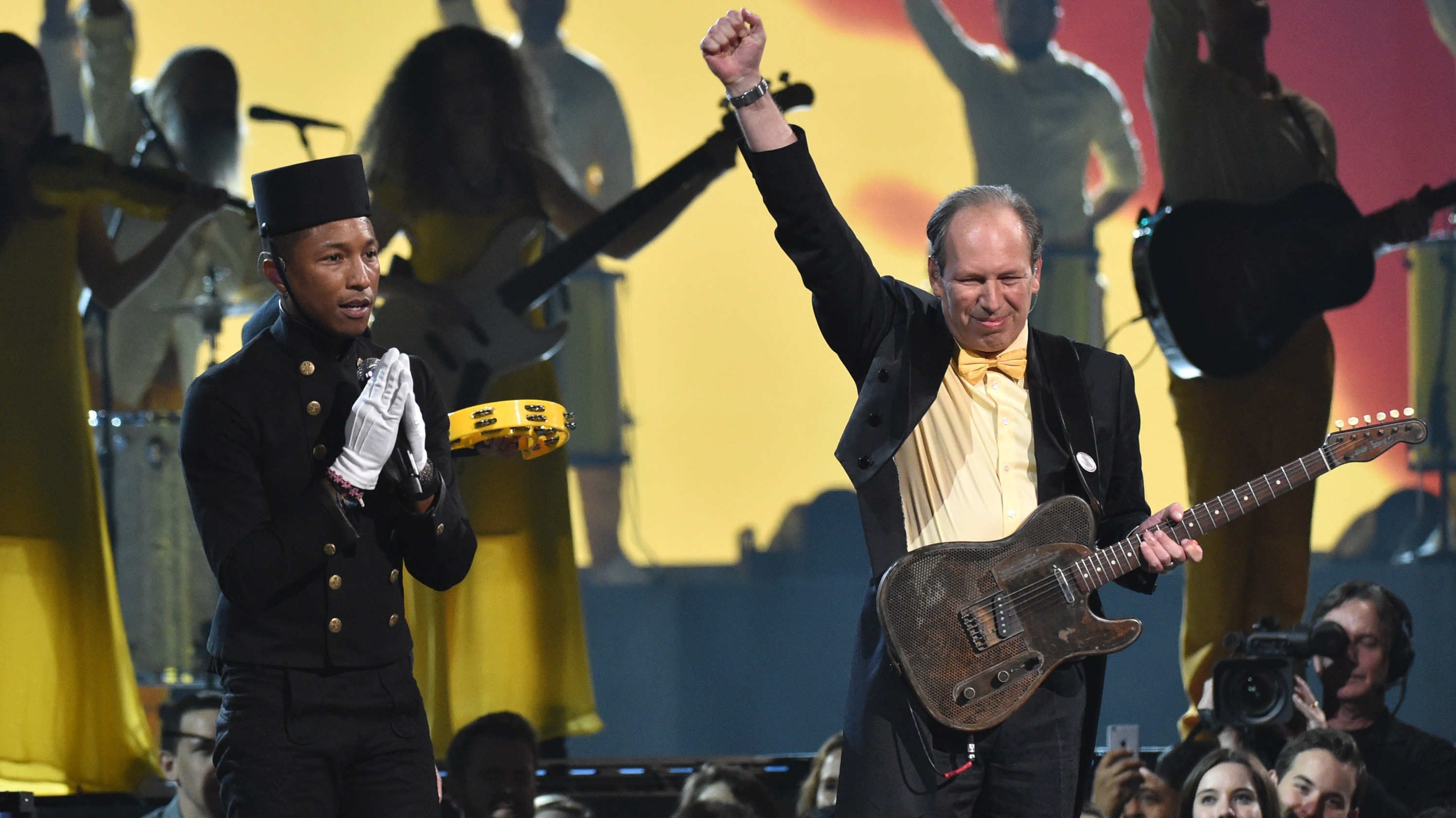 Pharrell predviedol verziu svojho hitu Happy a doprevádzal ho klasický klavirista Lang Langa či gospeloví speváci. Na pódiu se objavila aj Katy Perry, írsky spevák Hozier so slávnou Annie Lennox či Gwen Stefani s Adamom Levinom, Kanye West, Madonna, Rihanna i Paul McCartney.