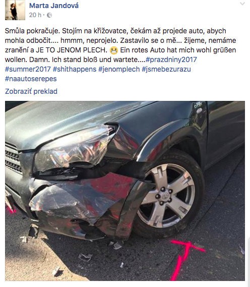 Našťastie sa nikomu nič nestalo. "Bola to veľká rana, ale hlavné je, že sme v poriadku," dodala speváčka, ktorá mala v aute aj štvorročnú dcéru Marušku.