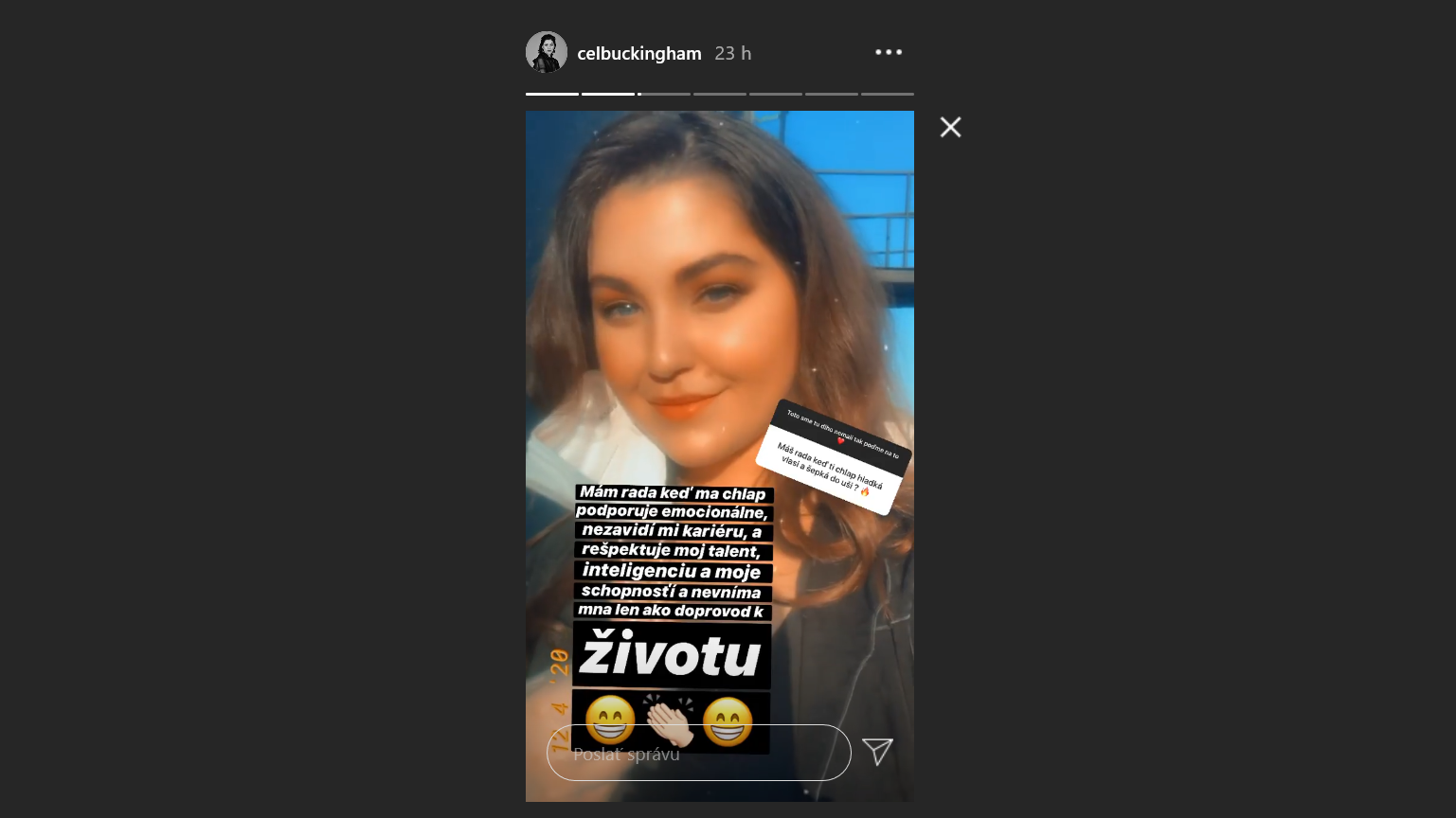 Ešte vo februári svoj nový objav ukázala verejnosti na Česko - Slovenskom plese v Prahe a zaľúbenci pôsobili spokojne a šťastne. Avšak čo bolo vtedy, dnes už neplatí a kráska je opäť single. V príbehu na svojej sociálnej sieti odkázala budúcemu adeptovi, čo od muža očakáva.