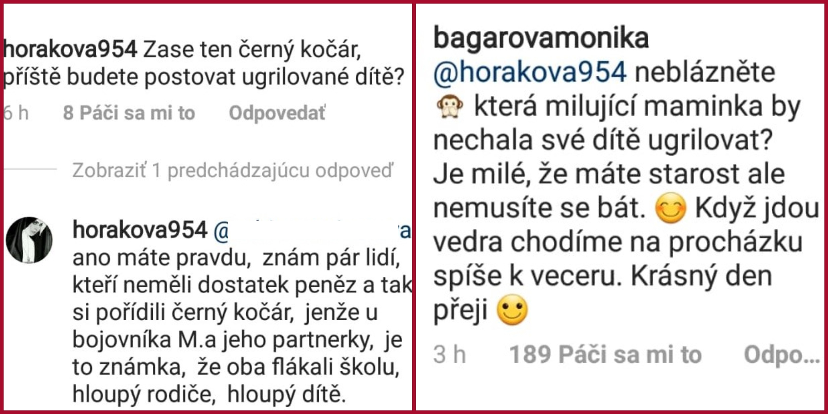 Okrem toho, že je sa jednoducho nepatrí drzo komentovať niečo, do čoho cudzieho človeka nič nie je, ešte aj napísala úplný nezmysel: "Zase ten čierny kočík? Nabudúce budete postovať ugrilované dieťa?" Zjavne fiktívny profil sa ďalej uchýlil aj k urážkam, ktoré si nezaslúžia pozornosť, no neuveriteľné je, že Monika dokázala aj na evidentne cielenú urážku reagovať milo: "Nebláznite, ktorá milujúca mamička by nechala svoje dieťa ugrilovať? Je milé, že máte starosti, ale nemusíte sa báť".
