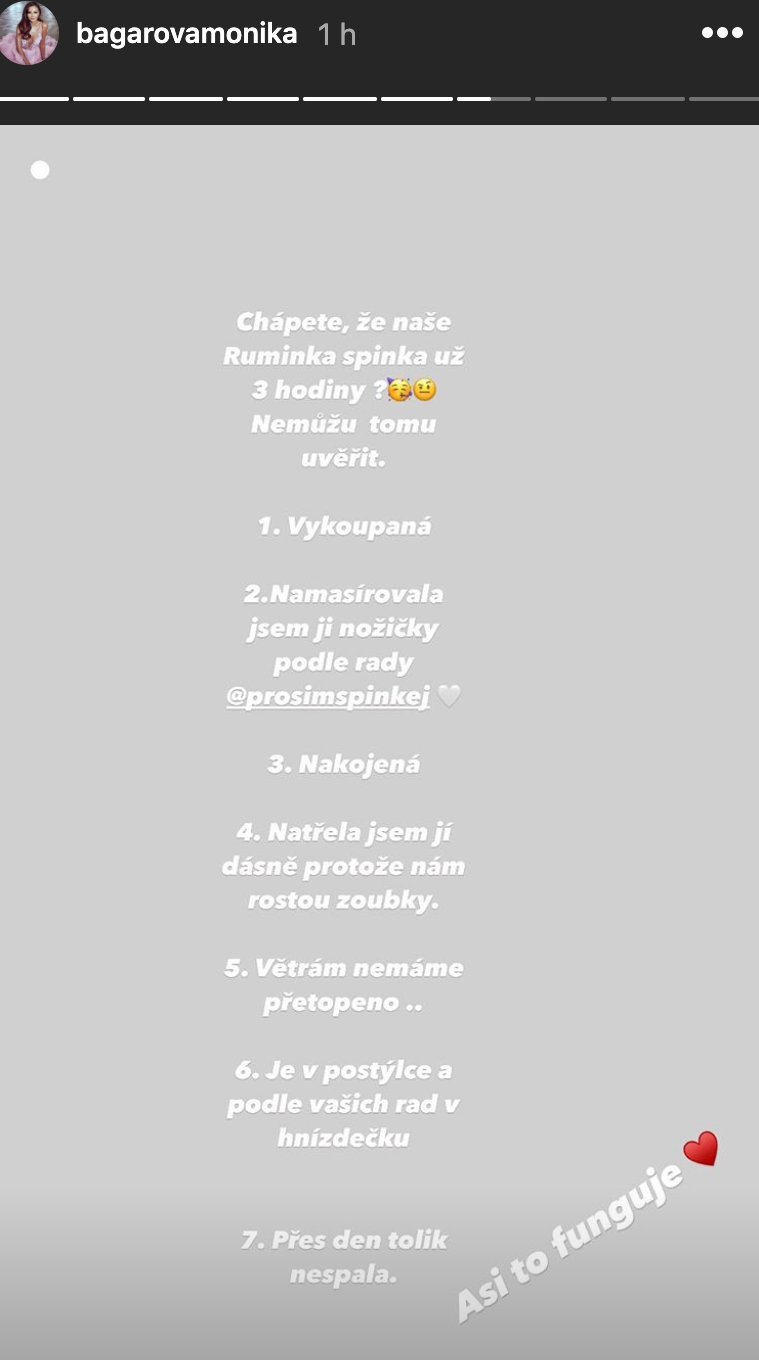 Hoci sa to dá prežiť, predsa len sú mesiace s nespavým bábätkom fyzicky veľké utrpenie. Tobôž, ak potrebuje žena počas dňa normálne fungovať, spánkový dlh narastá a neraz to môže skĺznuť aj do rôznych psychických problémov. Monika sa preto chopila slamky a využila rady, ktoré jej prišli do správ na Instagrame od desiatok, či azda až stoviek mamičiek. "Chápete, že naša Ruminka spinká už asi tri hodinky? Nemôžem tomu uveriť," napísala Monika vďačne a pridala zoznam, čo všetko večer spravila.
