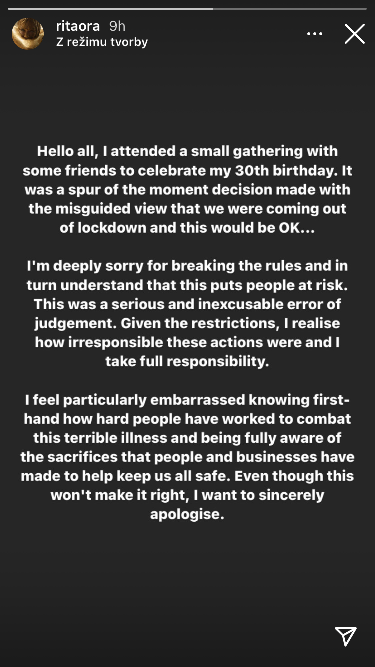 "Išlo o vážnu a neospravedlniteľnú chybu v úsudku. Vzhľadom na obmedzenia si uvedomujem, aké nezodpovedné boli moje kroky a beriem na seba plnú zodpovednosť. Obzvlášť trápne sa cítim, keďže viem, ako tvrdo ľudia pracovali v boji proti tejto hroznej chorobe," napísala okrem iného Rita v príbehu na Instagrame, a narážala tým zrejme na vlastnú matku, ktorá je lekárka v odbore psychiatrie. Ešte v prvej vlne pandémie sa speváčka vyjadrila, aká je na mamu Veru pyšná po tom, čo sa rozhodla pomáhať kolegom lekárom v prvej línii. Výčitky dotiahli údajne Ritu nasledujúce ráno až na policajnú stanicu, kde vraj dobrovoľne zaplatila pokutu 10- tisíc libier.