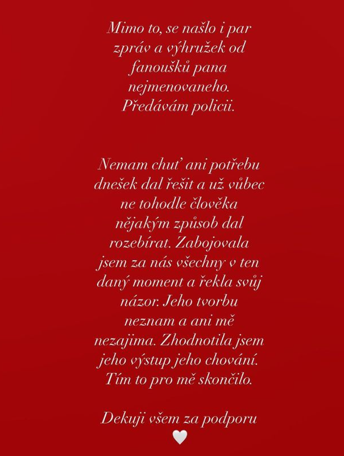 Dalo sa čakať, že fanúšikom rapera Řezníka sa jej slová nebudú vôbec páčiť, čo sa aj stalo. Speváčka teraz čelí hrozbám, ktoré bude riešiť polícia. "Okrem krásnej správy sa objavilo aj pár vyhrážok od fanúšikov pána nemenovaného. Odovzdávam ich polícii," napísala Monika na sociálnej sieti. "Už vôbec nechcem tohto človeka nejakým spôsobom rozoberať. Zabojovala som za nás všetkých v ten daný moment a povedala som svoj názor. Jeho tvorbu nepoznám a ani ma nezaujíma. Zhodnotila som jeho výstup, jeho správanie. Tým to pre mňa skončilo. Ďakujem všetkým za podporu," dodala odvážna speváčka. Snáď ostanú hustí Řzníkovi fanúšikovia len pri slovách, ako to obvykle pri internetových hrdinoch aj, našťastie, býva.