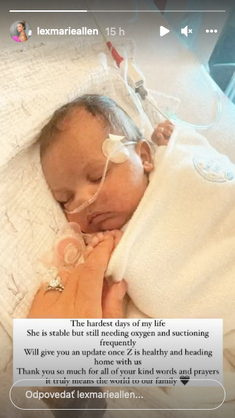 Zara je už stabilizovanom stave a Allen sa nezabudol poďakovať jej záchrancom. "Ďakujem úžasnému tímu záchranárov, ktorý vrátil Zare zdravú farbu a tiež sa postarali, aby mohla opäť dýchať," napísal v príspevku na sociálnej sieti. "Bude to ťažká noc," povzdychol si ustarostený otecko. Aj jeho manželka Alexis pridala svoj názor. "V podstate, ak vaše dieťa nemá modré pery, nebudú vás ani riešiť. To bolo mojich posledných 24 hodín," zverila sa so svojimi starosťami. "Ani jeden lekár si nenašiel čas na to, aby ju skutočne vypočul a uistil sa, že je naozaj v poriadku - 10 minút a von. To, čo vidí a počuje mama sestrička, je také desivé," opísala bývalá zdravotná sestra v krátkosti skutočnosť, s akou má skúsenosť aj nejeden rodič na Slovensku.