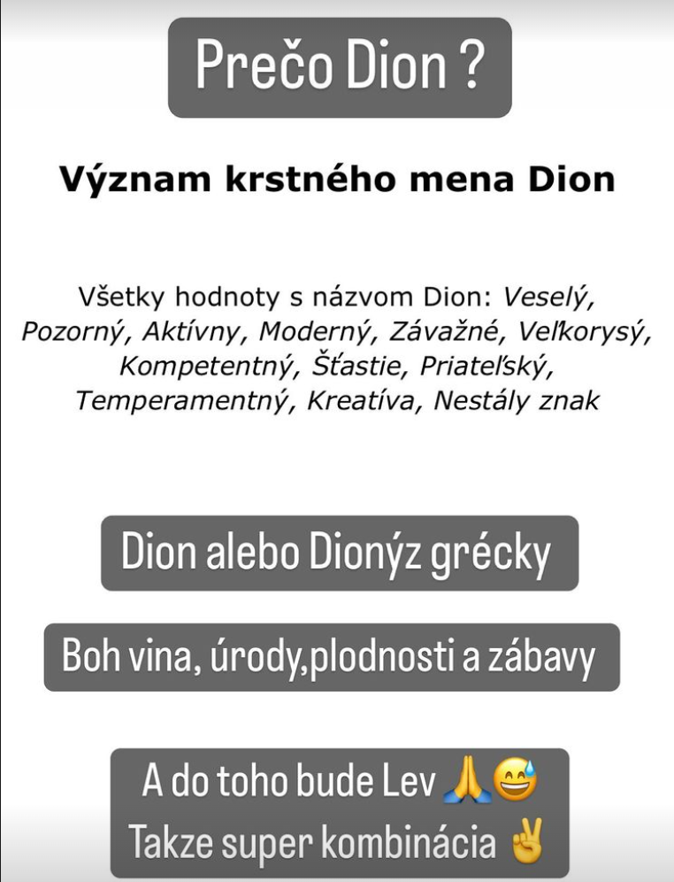 Aby toho nebolo málo, šťastní budúci rodičia rovno prezradili aj to, ako sa bude synček volať. Pochopiteľne, asi nikto nečakal Janka ani Paľka, no menom DION, obľúbenom údajne najmä v Albánsku, skutočne prekvapili. Zuzana pridala aj zdôvodnenie, prečo práve toto meno a aký je jeho význam.