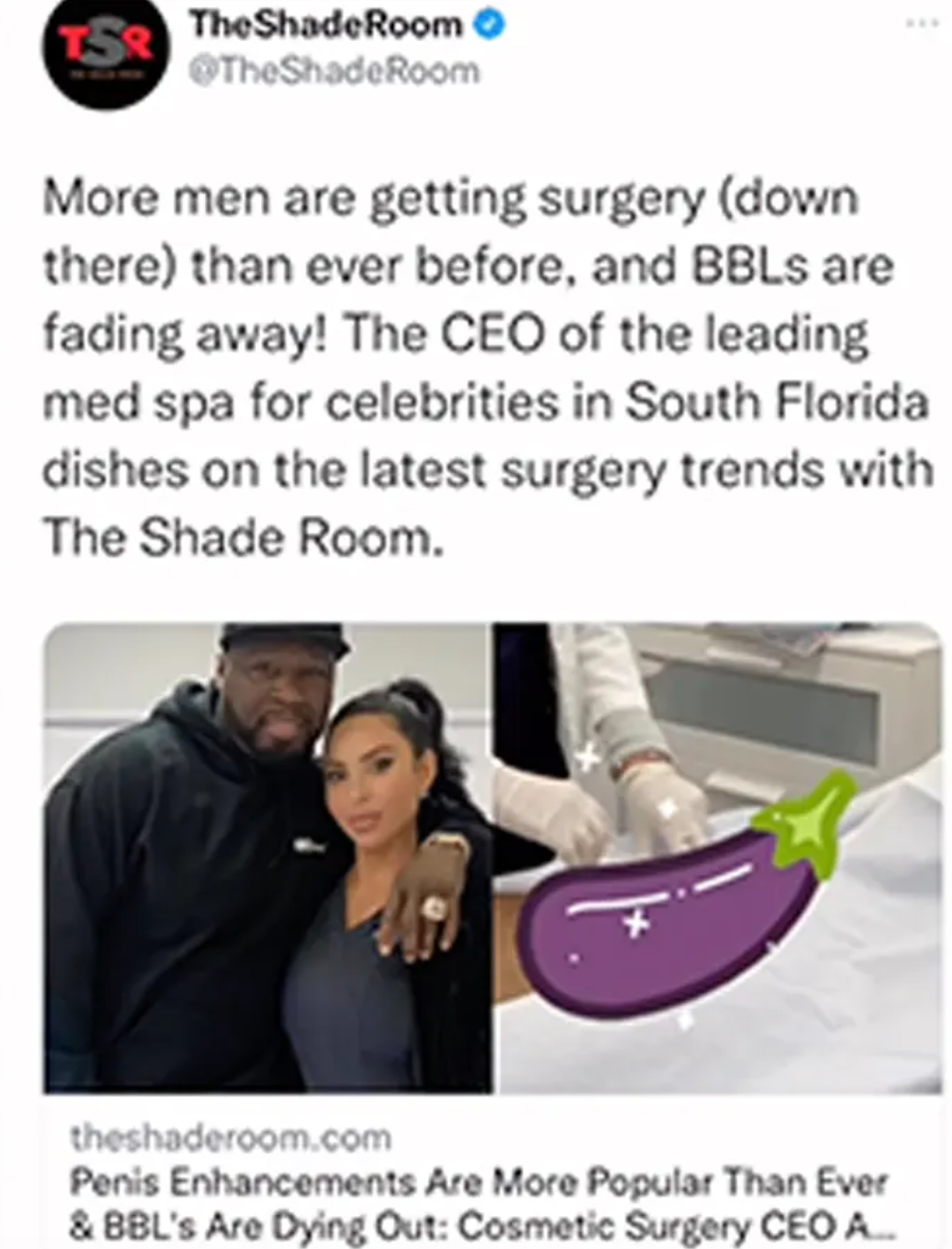 Raper 50 Cent, vlastným menom Curtis Jackson III, žaluje majiteľku kliniky plastickej chirurgie v Miami za to, že údajne jasne naznačila, že bol jej klientom. Možno by mu to až tak neprekážalo, ak by nešlo o údajné zväčšenie penisu. V žalobe upozorňuje na fotografiu, ktorú mal 50 Cent urobiť s Angelou Kogan, majiteľkou kliniky, a ktorú mala neskôr použiť na propagáciu svojej kliniky. Fotografia sa objavila v istom už medzičasom odstránenom článku, v ktorom údajne uviedla 50 Centa medzi svojimi klientmi.