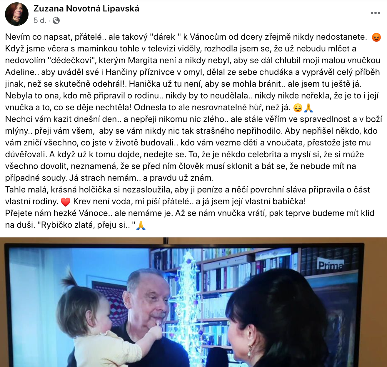 "Rozhodla som sa, že už nebudem mlčať a nedovolím 'dedkovi', ktorým Margita nie je a nikdy nebol, aby sa naďalej chválil mojou malou vnučkou Adeline, aby uvádzal svojich a Haniných priaznivcov do omylu, robil zo seba chudáka a celý príbeh rozprával inak, ako sa v skutočnosti odohral... Toto malé, krásne dievčatko si nezaslúžilo, aby ho peniaze a nejaká cudzia povrchná sláva pripravili o časť vlastnej rodiny. Krv nie je voda, píšu mi priatelia. A ja som jej vlastná babička," uviedla vo svojom príspevku rozhorčená Lipavská. Je jasné, že inak to vidí jej vlastná dcéra Barbora, ktorej to prišlo trápne, a tak sa k mame vyjadrila zo svojho pohľadu ona. "Moja mamička nie je v poriadku, preto s ňou nie som už dlho v kontakte. Také veci sa z jej strany dejú a budú diať. Trvá to už asi šesť mesiacov a nie je to správne. Ale čo chcete vysvetliť človeku s problémami? Skúšala som, ale nešlo to," načrtla Barbora situáciu s mamou.