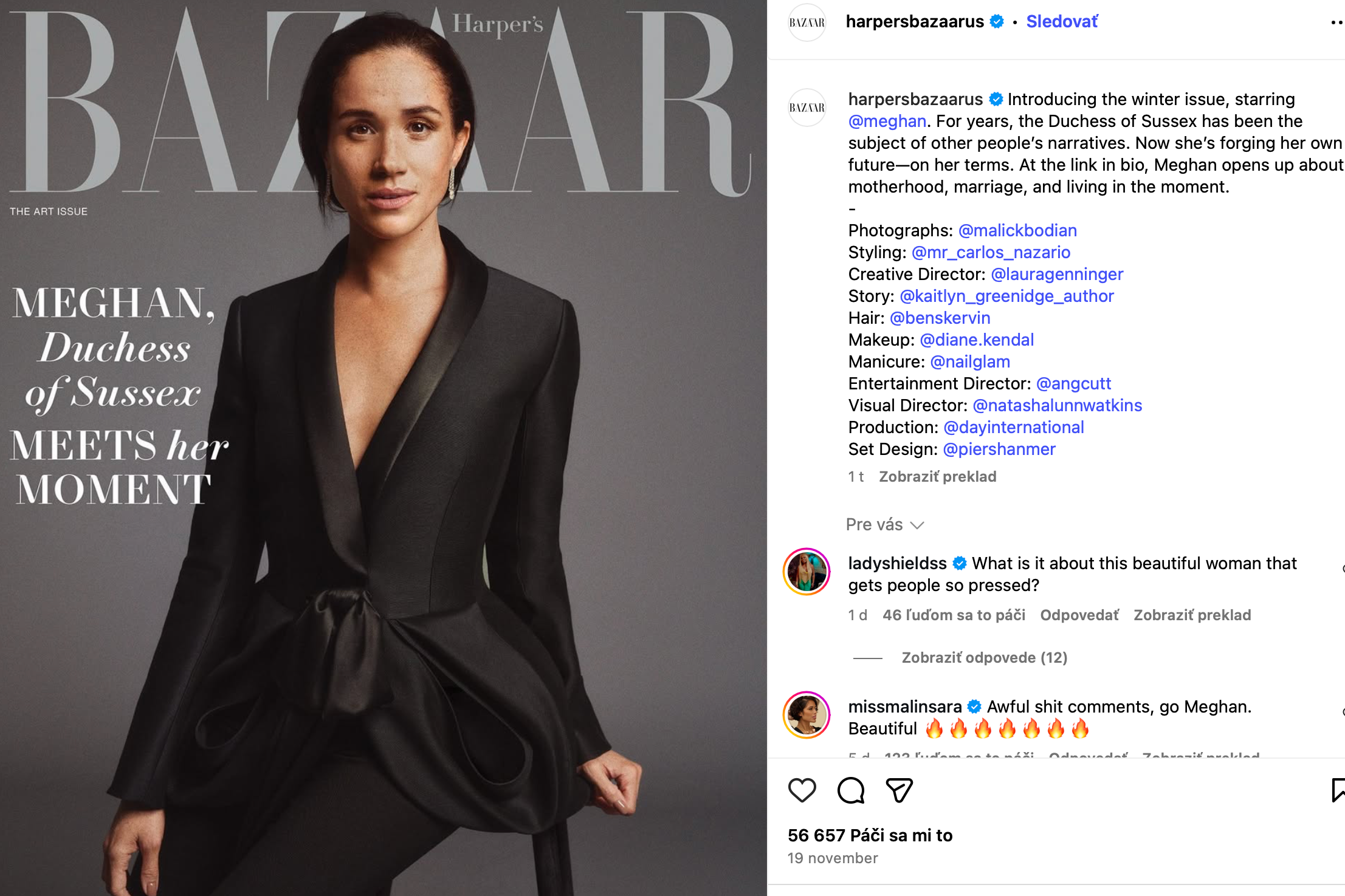 Z obálky decembrového čísla magazínu Harper’s Bazaar pozerá Meghan Markle, ktorá získala vďaka manželstvu s princom Harrym titul vojvodkyňa zo Sussexu a používa ho vytrvalo aj v USA, kde spolu s ich dvomi deťmi žijú od roku 2020. Na jej tvári nemá veľa mejkapi, oblečená je v elegantnom tmavošedom kostýme a treba uznať, že jej to sekne. Súčasťou vydania je aj rozsiahly rozhovor doplnený jej fotkami v rôznych outfitoch v jednoduchom štýle. Práve ten ju vyjadruje najviac, no dobre zapadá aj do jej podnikateľských aktivít s vlastnou lifestylovou značkou As Ever. Okolo toho, spomienok, jej názorov, ako aj vzťahov sa točil aj rozhovor.