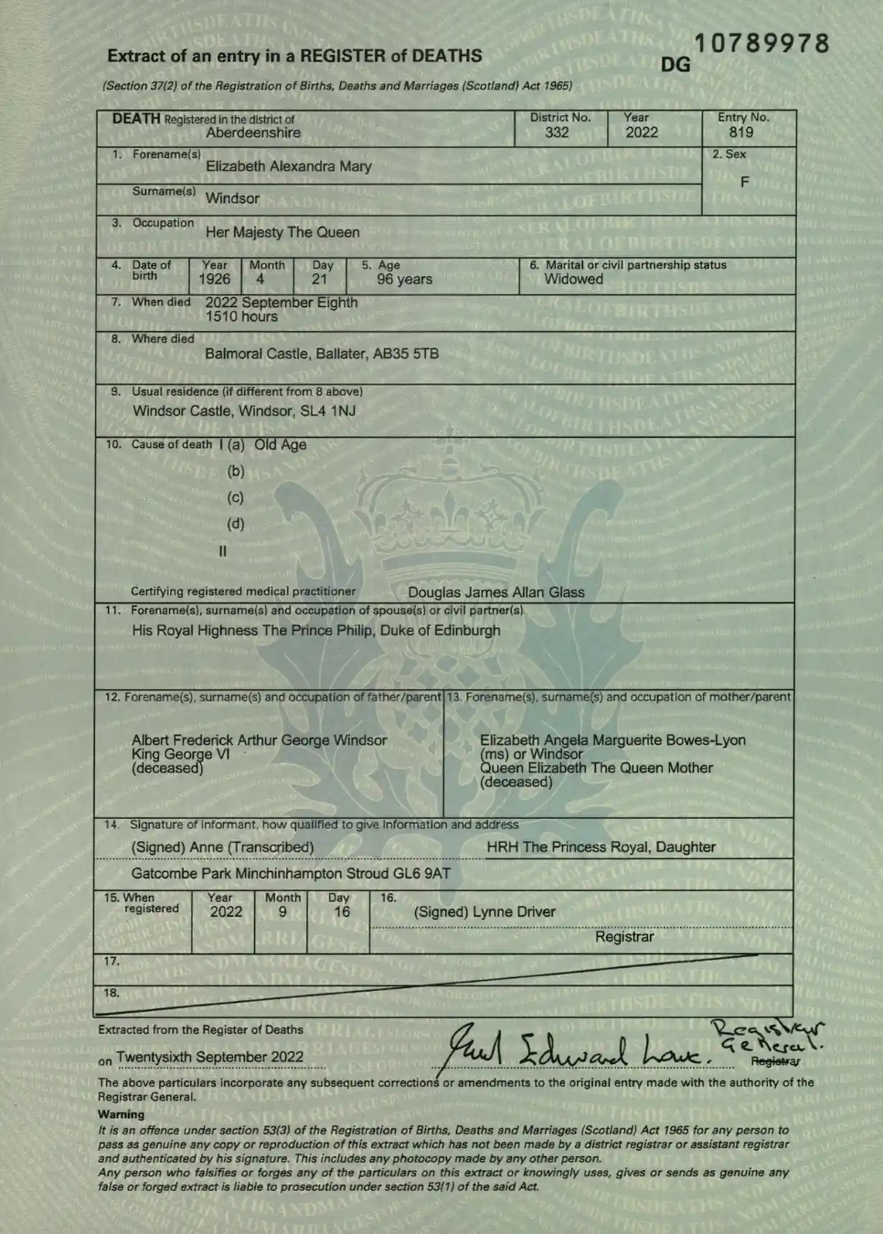Na verejnosť sa aktuálne dostal úmrtný list panovníčky. Žiadna senzácia sa nekonala, čo sa týka príčiny úmrtia. Verdikt je jasný a celkom logický - kráľovná zomrela "na starobu". Generálny matrikár pre Škótsko Paul Lowe potvrdil, že úmrtný list kráľovnej bol zaregistrovaný 16. septembra v Aberdeenshire. V dokumente sa uvádza, že 96-ročná panovníčka zomrela 8. septembra o 15.10 h na zámku Balmoral v Ballateri. Úmrtie svojej matky nahlásila princezná Anna.