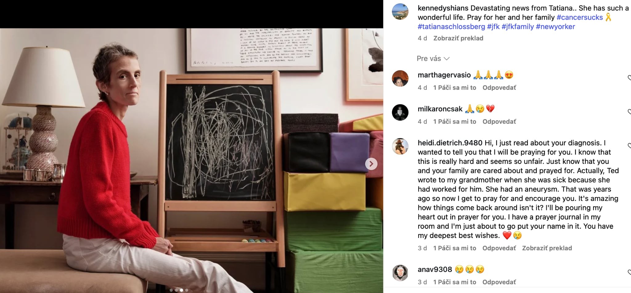 Schlossbergová sa o svojom ťažkom boji s diagnózou rozhodla zdôveriť v rozsiahlej eseji v magazíne NewYorker, v ktorej čitateľom priblížila pocity ženy, ktorá v najkrajšom období života počula tie najťažšie slová z úst lekárov. "Neverila som, nedokázala som uveriť, že hovoria o mne," napísala vo svojom vyjadrení Schlossbergová. O svojej diagnóze sa totiž dozvedela krátko po narodení svojho druhého dieťaťa s manželom Georgeom Moranom v máji 2024 a odvtedy podstupuje liečbu. "Deň predtým som v bazéne zaplávala takmer dva kilometre, hoci som bola v deviatom mesiaci tehotenstva. Nebola som chorá. Necítila som sa chorá. Vlastne som bola jednou z najzdravších ľudí, ktorých som poznala," píše ďalej Tatiana v bolestnom vyznaní.