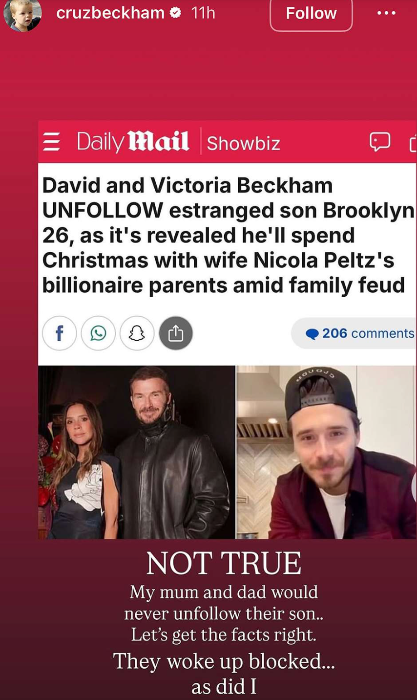Aktuálne sa objavili správy, že Victoria a David Beckhamovci už prestali sledovať svojho najstaršieho syna Brooklyna na sociálnych sieťach. To sa ale rozhodol objasniť ich najmladší syn Cruz. Pred pár dňami na Instagrame zdieľal fotku článku v Daily Mail s titulkom: "David a Victoria Beckhamovci PRESTALI sledovať svojho syna Brooklyna, keďže sa ukázalo, že strávi Vianoce s miliardárskymi rodičmi svojej manželky Nicoly Peltz uprostred ich rodinných sporov." Cruz sa voči správe ohradil a označil ju za nepravdivú. Vysvetľoval: "Moji rodičia by nikdy neprestali sledovať svojho syna. Ujasnime si fakty. Zobudili sa zablokovaní... rovnako ako ja." Tým jasne naznačil, kto začal s blokovaním.