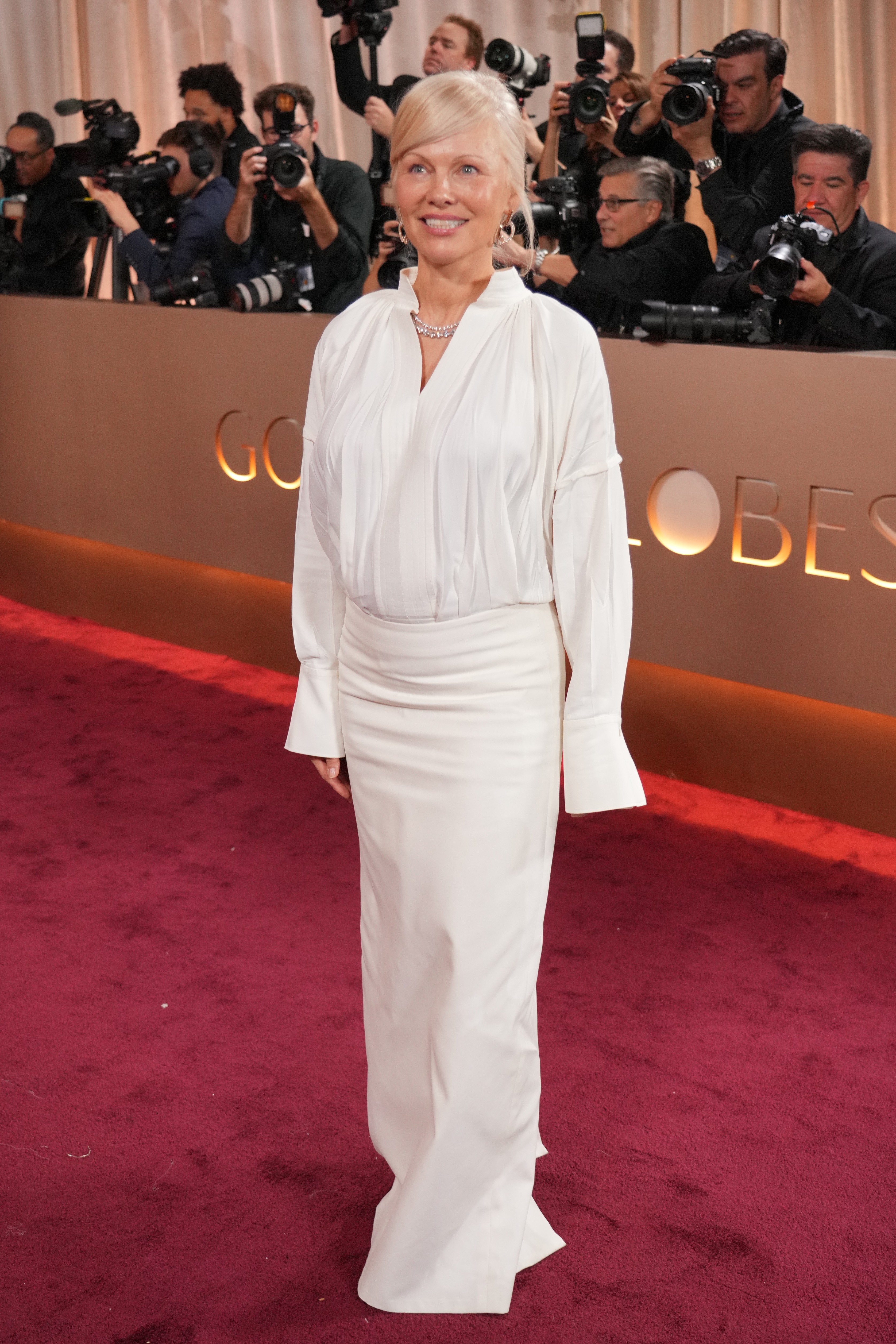 Pamela Anderson zvolila na nedeľný večer na udeľovaní cien Zlatý glóbus 2026 klasickú bielu košeľu Ferragamo, ktorú skombinovala s ladiacou rozširujúcou sa sukňou. Celý look doplnila nádychom luxusu v podobe diamantových kruhových náušníc a trojice ladiacich náhrdelníkov od značky Pandora.