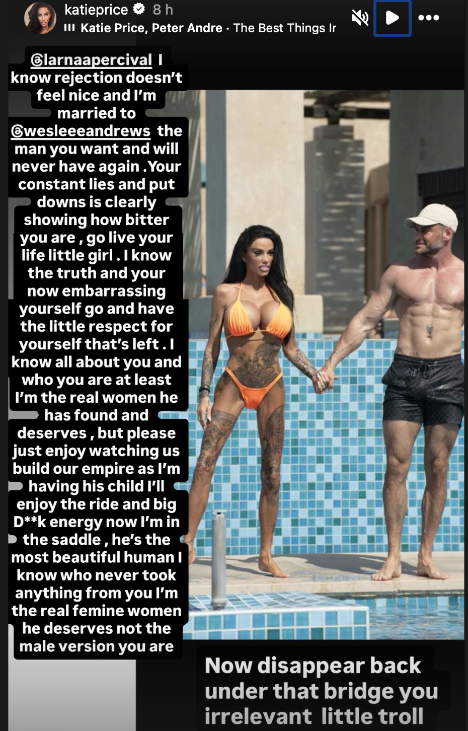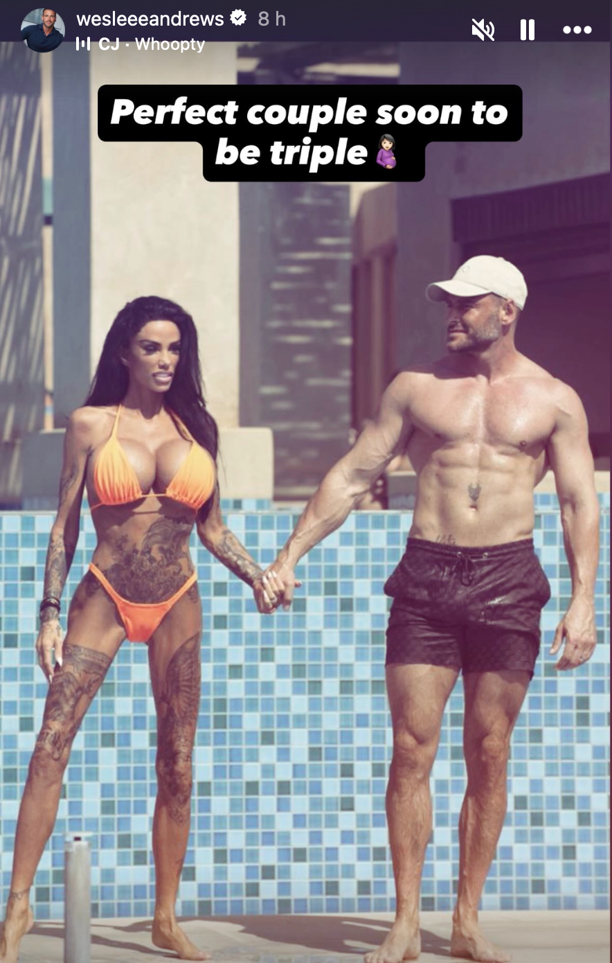 Price a jej štvrtý manžel Lee Andrews oznámili, že čakajú svoje prvé spoločné dieťa. Katie sa vrátila do Veľkej Británie, kde ju čakala nič netušiaca rodina, len pár dní po svadbe, ale potom odletela späť do Spojených arabských emirátov na svadobnú cestu a ktovie, či práve vtedy počali. Lee tiež potvrdil správu o dieťati, keď zdieľal fotku seba a Katie a napísal: "Perfektný pár, čoskoro trojica."