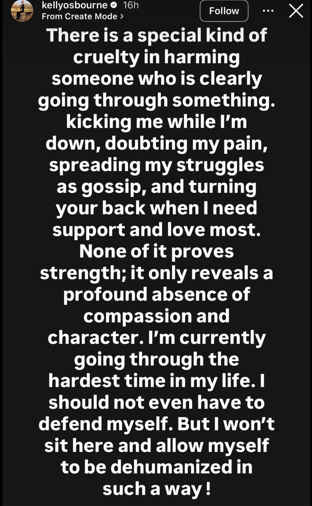 Na komentáre sa Kelly rozhodla reagovať následne vo svojom instagramovom príbehu: "Existuje zvláštny druh krutosti v ubližovaní niekomu, kto zjavne niečím prechádza. Kopú do mňa, keď som na dne, spochybňujú moju bolesť, šíria klebety a odvracajú sa odo mňa, keď najviac potrebujem podporu a lásku," napísala Kelly v emotívnom príspevku. "Nič z toho nedokazuje ich silu; iba to odhaľuje hlbokú absenciu súcitu a charakteru. Momentálne prechádzam najťažším obdobím svojho života. Nemala by som sa ani musieť brániť. Ale nebudem tu sedieť a nedovolím, aby som bola takýmto spôsobom dehumanizovaná," povedala odhodlane.
