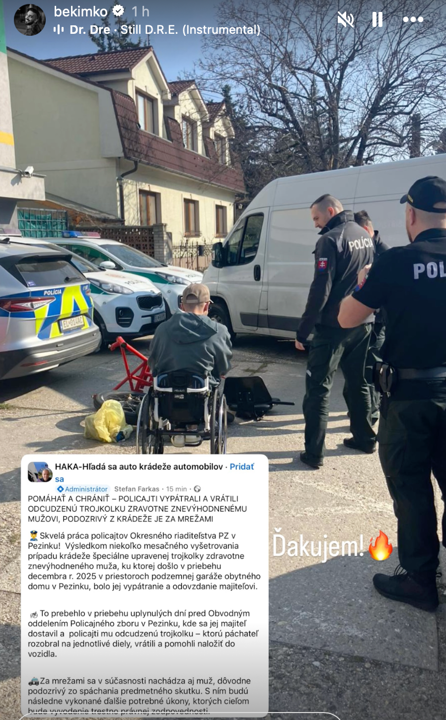Zlodeji pritom preukázali poriadnu dávku drzosti. "Niekto prišiel, zaparkoval si tam auto a naložil si tam dva a pol metra to má na dĺžku, meter dvadsať na šírku a asi tridsať kíl to má. Takže toto si naložil do auta. Cením si ľudí, ktorí potrebujú kradnúť veci, ktoré sú vyslovene pre vozíčkara," hovorí zronený Bekim. Po niekoľkých mesiacoch vyšetrovania však prišla dobrá správa. Policajtom z Okresného riaditeľstva v Pezinku sa podarilo trojkolku vypátrať.