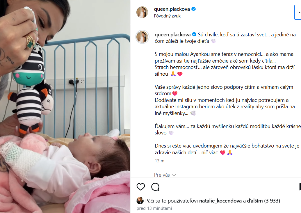 Veľkú oporu nachádza aktuálne aj vo svojich fanúšikoch, ktorí ju zaplavili správami plnými podpory. "Vaše správy, každé jedno slovo podpory cítim a vnímam celým srdcom," odkázala dojatá Zuzana. Sociálna sieť sa tak pre ňu stala miestom, kde aspoň na chvíľu dokáže uniknúť od ťažkej reality a načerpať silu. Plačkovej slová dojali tisíce ľudí a mnohí jej posielajú modlitby aj pozitívnu energiu. "Dnes si ešte viac uvedomujem, že najväčšie bohatstvo na svete je zdravie našich detí… nič viac," dodala na záver. Všetci teraz veria, že sa situácia čoskoro obráti k lepšiemu a malá Ayana bude čoskoro opäť doma v bezpečí náruče svojej mamy.
