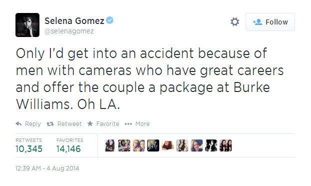 Dvadsaťdvaročná rodáčka z texaského Grand Prairie obvinila z nehody paparazzov, ktorí ju údajne rozptyľovali. Gomez bola so svojimi kamarátkami na obede a na nákupe, pričom k nehode došlo pri odchode z parkoviska.
