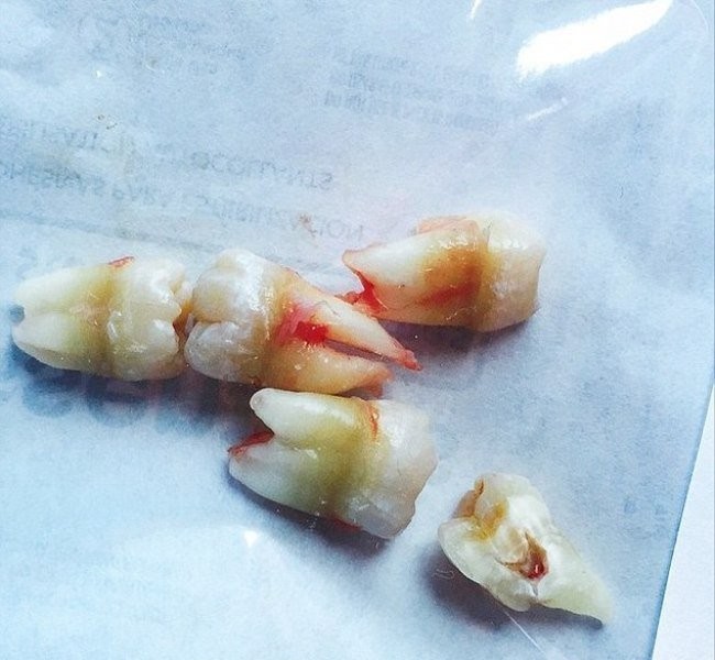 O dva dni neskôr zverejnila škandalózna Miley na instagrame oveľa chúlostivejšiu fotografiu, a to päť čerstvo vytrhnutých zubov položených vedľa seba. Na niektorých bolo vidieť ešte jasné stopy po krvi.