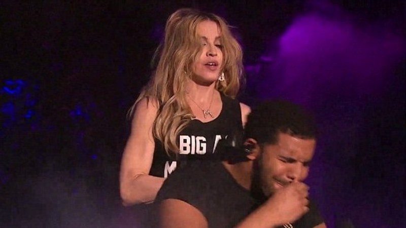 Madonna sa na niekoľko sekúnd prisala na ústa bývalého priateľa speváčky Rihanny, a hoci sa zdalo, že sa snaží od nej odtrhnúť, chytila mu ruku. Až keď Drake začal dupať nohou, speváčka prerušila francúzsky bozk.