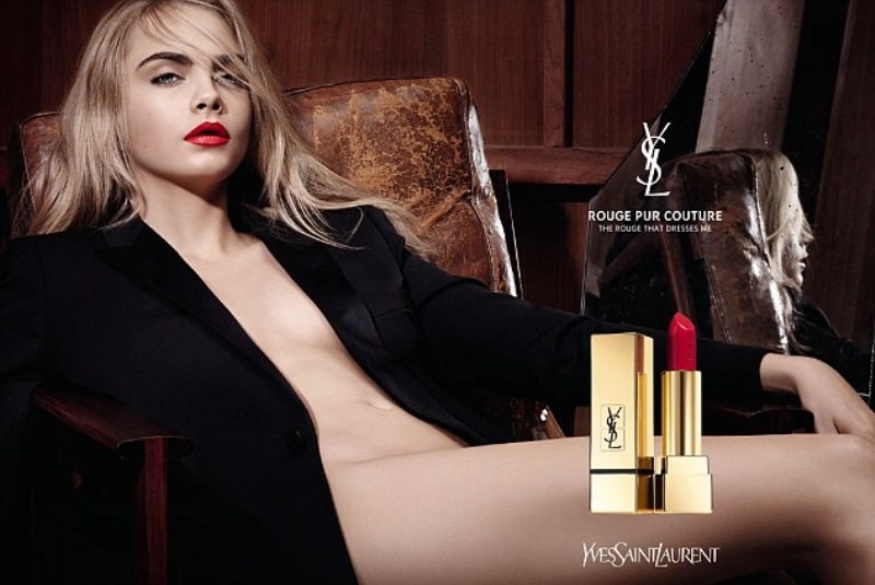 Britská modelka Cara Delevingne hviezdi v novej kampani na luxusné rúže Yves Saint Laurent. Dvadsaťtriročná kráska má na zvodnom obrázku oblečené len rozopnuté čierne sako... a rúž!