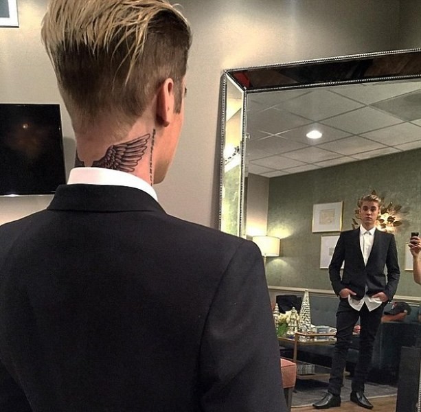 Tentoraz si popový spevák nechal ozdobiť zátylok, a to párom anjelských krídel. Na obrázku, ktorý ihneď zarezonoval medzi jeho oddanými fanúšikmi, stojí Bieber v obleku pred zrkadlom a výrazné tetovanie sa nedá prehliadnuť.