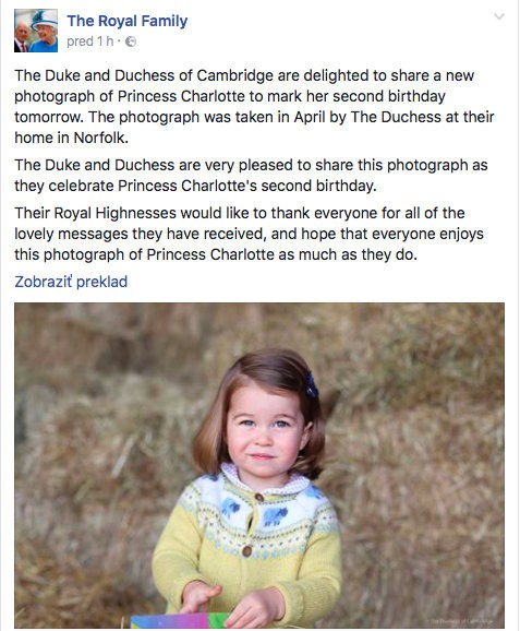 Dcéra budúceho anglického kráľa prišla na svet 2. mája 2015. Jej oficiálne celé meno znie Charlotte Elizabeth Diana. Už zajtra oslávi svoje druhé narodeniny a kráľovský palác zverejnil pri tejto príležitosti jej aktuálny snímok.