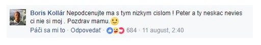 Mnohých však určite prekvapilo, keď na príspevok zareagoval aj samotný Kollár, ktorý nechal adminovi výstižný odkaz. "Nepodceňujte ma s tým nízkym číslom! Peter a ty neskáč, nevieš, či nie si môj. Pozdrav mamu," napísal.