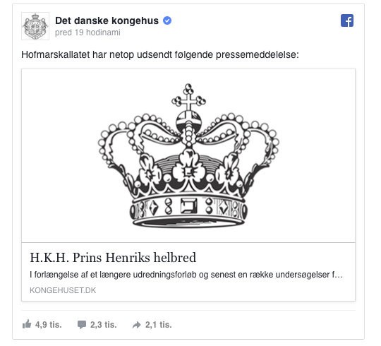 Dánsky kráľovský palác vydal vyhlásenie, v ktorom uvádza, že princ Henrik (83) trpí demenciou. "Po mnohých vyšetreniach a podľa najnovších výsledkov z leta dospel tím odborníkov k záveru, že Jeho kráľovská Výsosť princ Henrik trpí demenciou," stojí vo vyhlásení.