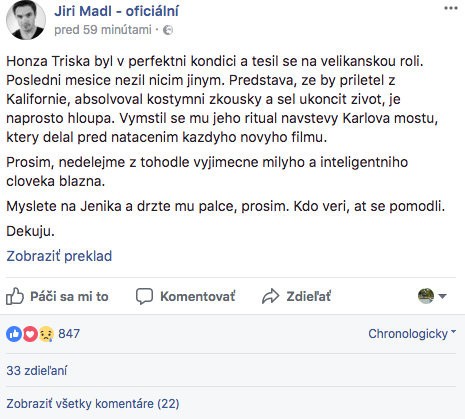 Už v pondelok mal nakrúcať nový film. Režisér Jiří Mádl napísal na sociálnej sieti Facebook odkaz, ktorým popiera, že by chcel slávny umelec skoncovať so životom.