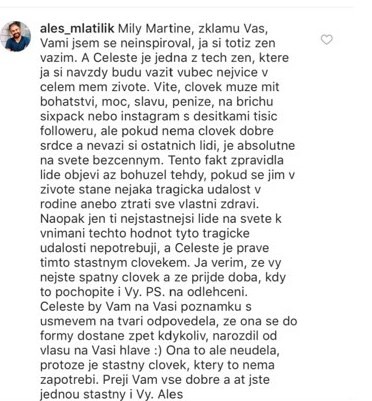 "Inak kľudne by sa mohla táto Celéste premenovať na Celestínske cesto na rezance. Ona a 24? Vyzerá ako 50-ročná tetka po štyroch vynosených deťoch. Takže Alešovi sa nečudujem. To pri nej už aj Božanka môže povedať, že má 24," uviedol v statuse Jakubec.