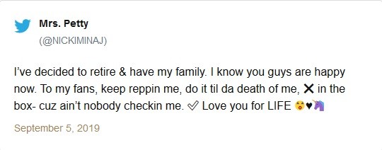 Z vyjadrenia navyše nebolo je jasné, či raperka definitívne končí s kariérou, alebo si chce od hudby iba oddýchnuť. Jej priaznivci netušia, či náhodou nečaká bábätko. Nicki Minaj sa totiž doteraz nevyjadrila ani ku svojej údajnej svadbe. Ešte v júni uviedla, že si chce zobrať svojho priateľa a v auguste už mala zmenené meno na Twitteri.