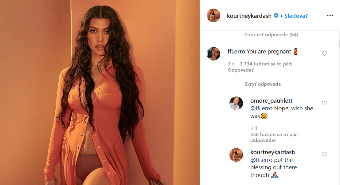Väčšinou sa fanúšikovia od hviezd tohto formátu odpovede nedočkajú, avšak motyka v tomto prípade vystrelila. „Nech sú požehnané tvoje slová,“ odpovedala samotná Kourtney a doplnila k tomu emoji zopnutých modliacich sa rúk. Niektorí fanúšikovia označili túto otázku ako drzú, no väčšina bola rovnako zvedavá. „Ó môj bože, ona to nepoprela! Tak teraz som z toho mimo, snaží sa o dieťatko?“ napísal ďalší fanúšik. „Tak toto by dávalo zmysel a odpoveď na to, prečo bola taká šialená v posledných častiach ich reality show,“ hádal iný fanúšik.