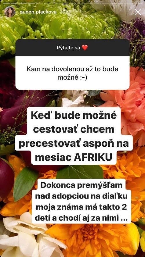 Influencerka rada cestuje, no aktuálne to nie je možné. Istý fanúšik bol ale zvedavý, kam sa po uvoľnení nariadení vyberie. "Keď bude možné cestovať, chcem precestovať aspoň na mesiac Afriku," prezradila svoju túžbu po exotike. No ešte prekvapivejšie bolo, čo vzápätí dodala, a ani sa jej na to nepýtali.