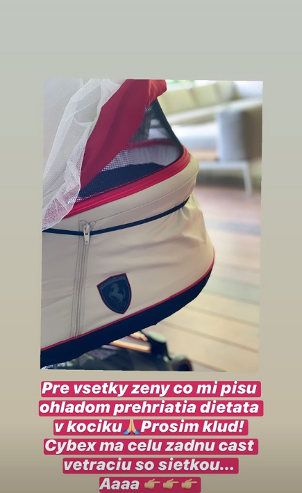 Ivana ale jednoznačne presne vie, čo robí. Na margo mnohých správ od fanúšičiek s "dobrými radami" sa preto rozhodla dať jasne najavo, ako to s jej kočíkom je. Ako mnohé iné, aj Ivanin luxusný kočík má prúdenie vzduchu zabezpečené. "Pre všetky ženy píšuce mi ohľadom prehriatia dieťaťa v kočíku. Prosím, kľud! Kočík má celú zadnú časť vetraciu so sieťkou," napísala a dokladovala aj fotkou.