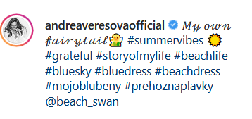 Na tom by nebolo nič zvláštne, v spojení s hashtagmi si tak mnohé celebrity naháňajú aj fanúšikov zo zahraničia. Akurát, že Andrea sa poriadne sekla, keď napísala: "My own fairytail". Iste tým myslela v preklade "Moja vlastná rozprávka", no pre chybu v slove "fairytail" napísala niečo ako "vílin chvost". Tail je totiž chvost, správne mala napísať slovo "fairytale", vtedy by to bola rozprávka.