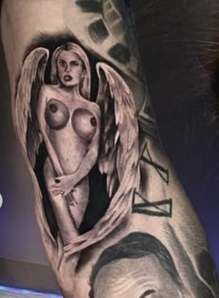 Dominantou kerky na Karlosovej ľavej paži sú nielen anjelske krídla, ale najmä Leline poprsie. No to sú jediné vydarené časti tetovania. Človek by si až myslel, že Karlos v polovici zmenil tatéra, lebo rozdiel nielen medzi polovicami tváre, ale medzi rukami vytetovanej Lely je obrovský.