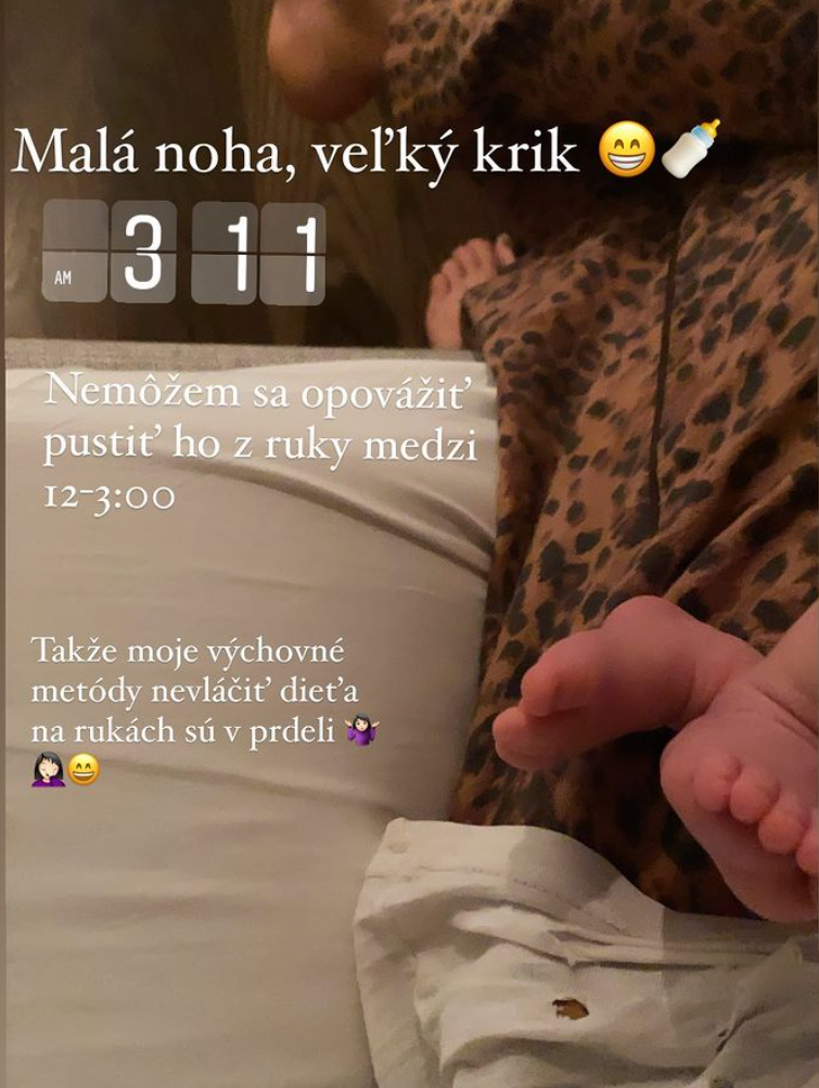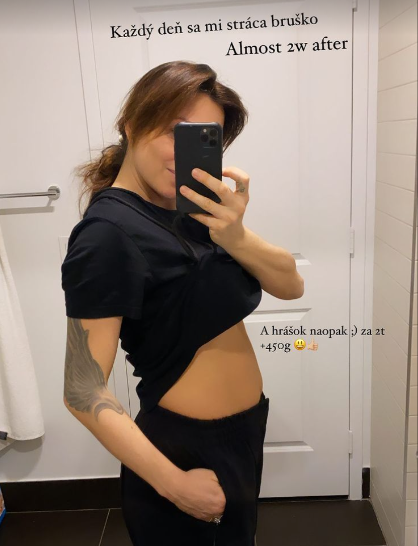 Je známa vec, že ženy, ktoré pred tehotenstvom pravidelne cvičia a majú pevné jadro tela, vrátane brušného svalstva, majú túto oblasť po pôrode skôr v pôvodnom stave, ak ovšem neschytajú diastázu, teda rozostúpenie brušného svalstva. To sa Saši evidentne nestalo. "Každý deň sa mi stráca bruško," napísala k fotke v instastories Orviská a je to úplne jasné. Kým jej brucho mizne, malý Jonatanko sa, naopak, utešene zaguľacuje: "Za dva týždne plus 450 gramov".