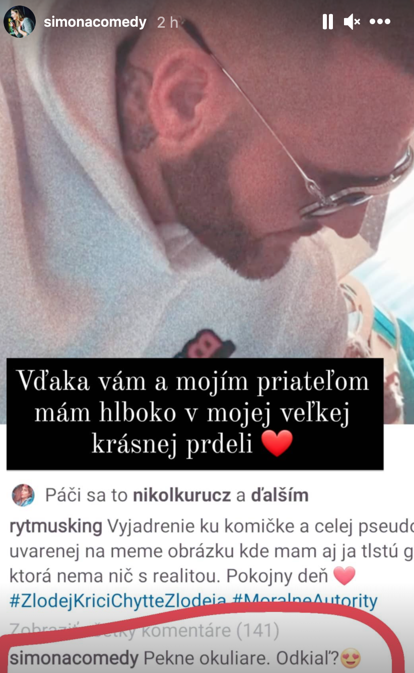 Správanie Simony označil za prízemné a zamindrákované a to ho primälo si spôsobom jemu vlastným z nej vystreliť, ako povedal, prízemný humor má rád. "Neviem, či to mám brať ako farizejstvo, lebo ty, ako komička, vieš čo sú meme obrázky, stretávaš sa s partiou komikov, kde používate humor, kde sú nadávky, urážate ľudí na hranici dôstojnosti, proste tvrdý, prízemný humor, tak zrazu obrázok, kde ja mám tiež tlstú hlavu a aj ty si tlstá porovnávate s realitou," vyjadril sa Rytmus a pripomenul, že tvrdý humor Simone a jej kolegom neprekáža, keď smeruje na iných, ale keď sa otočí na nich, je zle. Raperovi sa za jeho vysvetlenie a názor lajky a súhlasné komentáre len tak hrnuli, no medzi nimi zasvietil aj jeden priamo od Simony: "Pekné okuliare, odkiaľ?" Typickou insta otázkou na profiloch influencerov dala jasne najavo, čo si o ich povrchnosti myslí, ale zároveň ukázala, že jej Rytmusov príspevok neušiel, no ani jej nestojí za reakciu.