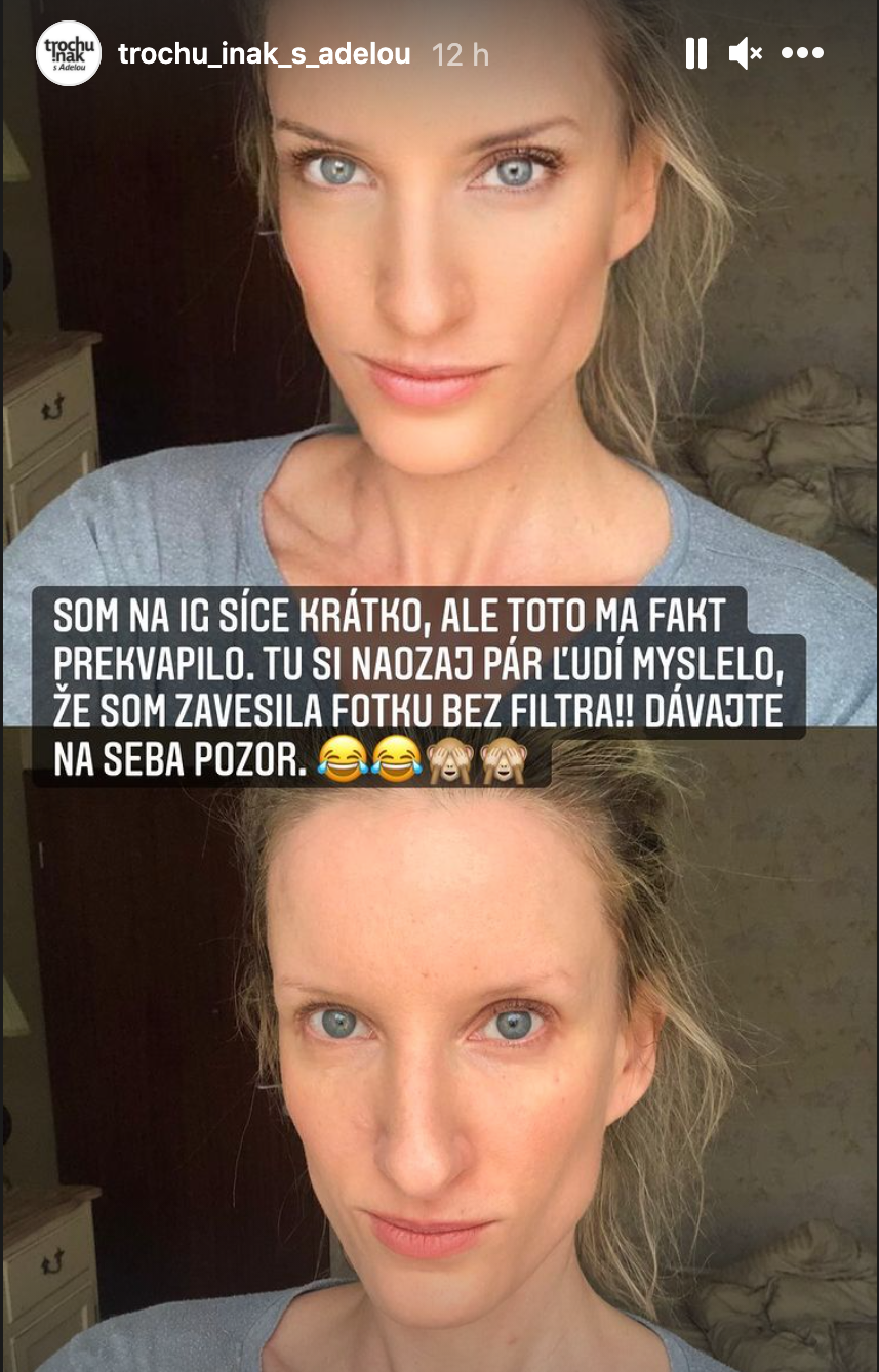 Adela si od nej aplikáciu vypýtala a zakrátko pribudla v stories fotka jej tváre v dokonalej podobe, s perfektnou pleťou a žiarivými očami. Bolo na prvý pohľad zrejmé, že fotka prešla filtrom. Ale zjavne nie každému. "Som na IG krátko, ale toto ma fakt prekvapilo. Tu si naozaj pár ľudí myslelo, že som zavesila fotku bez filtra. Dávajte na seba pozor," odkázala šokovaná Adela, ktorá sa stretla naživo s temnou realitou dopadu nereálnych fotiek na sociálnych sieťach na kritické vnímanie ľudí.