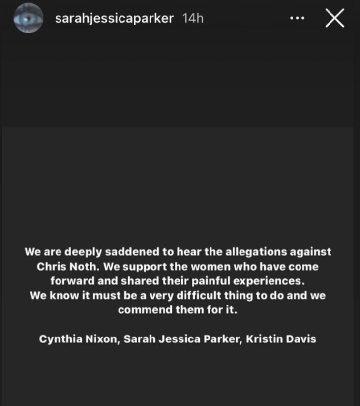 Jeho herecké kolegyne zo seriálu Sex v meste, Sarah Jessica Parker, Cynthia Nixon a Kristin Davis sa vyjadrili k tejto záležitosti medzi prvými. Prejavili plnú podporu ženám, ktoré obvinili Chrisa Notha zo znásilnenia. "Obvinenia voči Chrisovi Nothovi nás hlboko zarmútili. Vyjadrujeme podporu ženám, ktoré sa odvážili podeliť o svoje bolestné skúsenosti. Vieme, aké to muselo byť ťažké, a skláňame sa pred nimi," napísali v spoločnom vyhlásení na sociálnych sieťach. Herečka Bridget Moynahan, ktorá hrá Natashu, Božského druhú manželku, sa k tejto záležitosti odmietla vyjadriť s tým, že by bolo nevhodné komentovať niečo, o čom nič nevie. Údajné obete podporila aj herečka Zoe Lister-Jones, ktorá uviedla, že herec sa počas ich spoločného účinkovania v seriáli Zákon a poriadok opakovane nevhodne správal k ženám a na pľaci bol opitý.