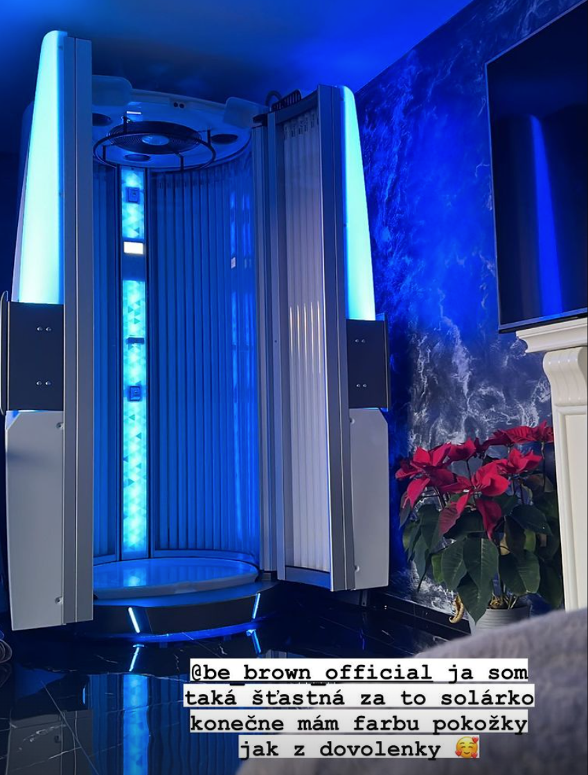 Z fotky je zrejmé, že tróni priamo v obývačke, naľavo od krbu a televízora. Na jednej strane je síce stále po ruke, ak Plačkovú náhle chytí túžba sa trošku opáliť, na druhej strane skutočne nejde o práve obvyklý estetický doplnok v centrálnej miestnosti domu. Nuž ale, proti gustu žiadny dišputát, ak to tak Strauszovcom vyhovuje, je to ich voľba. Keď budú organizovať párty, majú hostia bronzovú pokožku zaručenú.