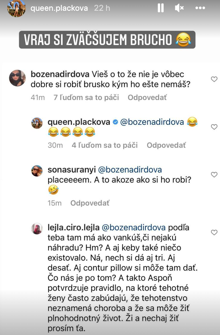 "Vieš o tom, že nie je vôbec dobré si robiť bruško, kým ho ešte nemáš?" zadelila zásadnú otázku jedna z "expertiek" a Zuzana vybuchla od smiechu, ako naznačila smajlíkmi. Nie je jasné, ako si toto "robenie bruška" daná komentujúca predstavuje, ale Plačková celkom jednoznačne ukázala, že jej bruško je pravé. Stiahla gate a žiadny vankúš, ani iná vypchávka tam neboli. A azda každá žena, ktorá už bola tehotná, vie, že tehotenské brucho sa skutočne nedá hrať.