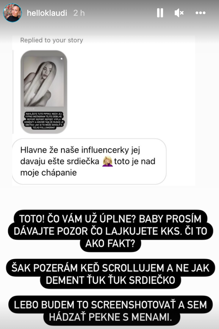 Klaudia vyzvala svojich podporovateľov, aby ruskú missku nahlasovali a tiež apelovala na tie slovenské influencerky, ktoré neovládajú azbuku, aby boli v týchto dňoch pozornejšie, čo ktorej ruskej influencerke lajknú. Je vysoko pravdepodobné, že ani Plačková si nepreložila Shishkovej vyhlásenie, no jej srdiečko pod ním je značný prešľap.