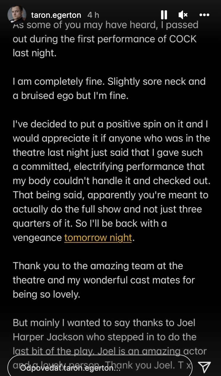 "Lekár, ktorý bol v hľadisku, Tarona okamžite po incidente ošetril, a hoci sa cítil dobre, rozhodlo sa, že Taronov náhradník Joel Harper-Jackson bude pokračovať v úlohe a dokončí predstavenie," upokojili fanúšikov sympatického herca, že už krátko po kolapse bol opäť v poriadku.