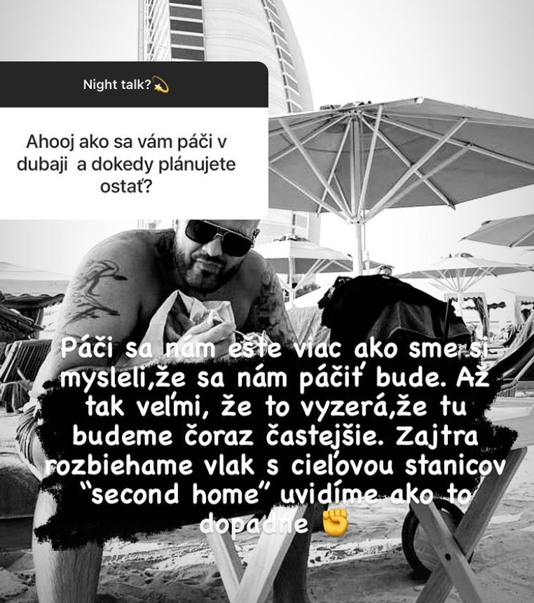 "Vyzerá, že tu budeme čoraz častejšie. Zajtra rozbiehame vlak s cieľovou stanicou 'druhý domov', uvidíme, ako to dopadne," priznala nadšená Jasmina a veľmi podobný príspevok, len o niečo stručnejší zverejnil aj Rytmus. Ktovie, možno sa stanú susedmi jeho expriateľky Dary, ktorý tiež vlastní v Dubaji nehnuteľnosť, apartmán si tam kúpila aj Dominika Cibulková. Vôbec pritom nemusí ísť o šialené peniaze, apartmány ďalej od centra či pláže sa dajú kúpiť už od zhruba 70 tisíc eur, no napríklad na slávnej Palme je to už takmer 600-tisícový špás. Snáď sa Vrbovskí pochvália, keď sa im tieto plány splnia.