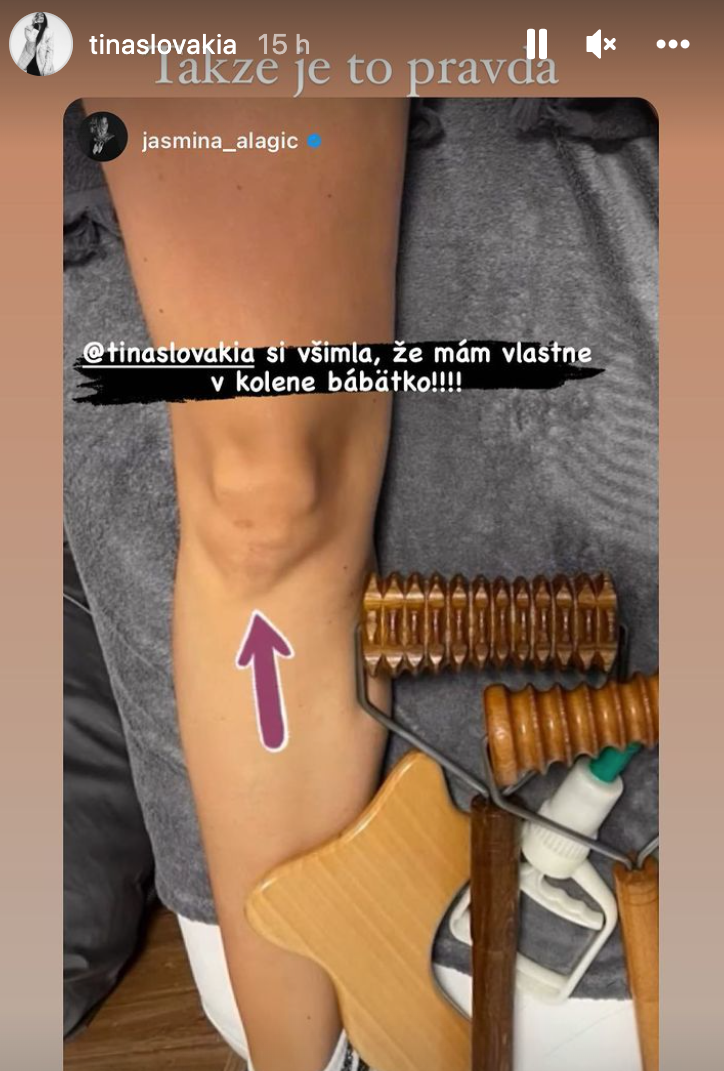 No napokon všetko zaklincovala Tina. Tá totiž objavila Jasminine bábätko tam, kde by ho skutočne nikto nikdy nehľadal. "Tina si všimla, že mám vlastne bábätko v kolene!!" napísala evidentne veľmi pobavená Jasmina k fotke jej kolena. Ale skutočne treba oceniť Tininu všímavosť, lebo hrou anatómie v spolupráci so svetlom a tieňom sa naozaj dá na Alagičovej kolene celkom jasne vidieť zvláštna tvár bábätka. Tina Jasmininu storku prezdieľala s vtipným dodatkom: "Takže je to pravda!" Kiežby tento objav pátračov po tehotenstve načas uspokojil a dali Vrbovským v tomto ohľade pokoj. Možno potom skutočne na potomkovi zapracujú...