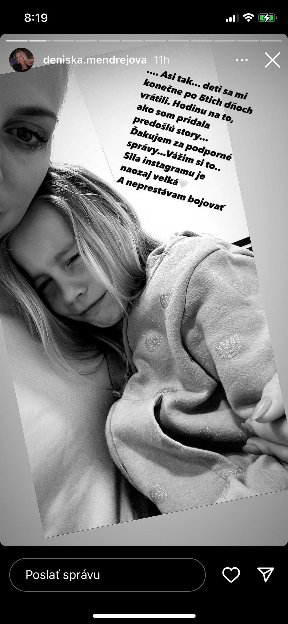 Zakrátko sa ale všetko obrátilo k lepšiemu a nezabudla o tom informovať na sociálnej sieti. "Moje deti sa mi konečne vrátili po piatich dňoch. Hodinu nato, ako som pridala predchádzajúce videá. Ďakujeme za podporujúce správy. Vážim si to. Sila Instagramu je skutočne veľká. A neprestávam bojovať," pokračovala Mendrejová a pridala fotografiu svojej plačúcej dcéry.