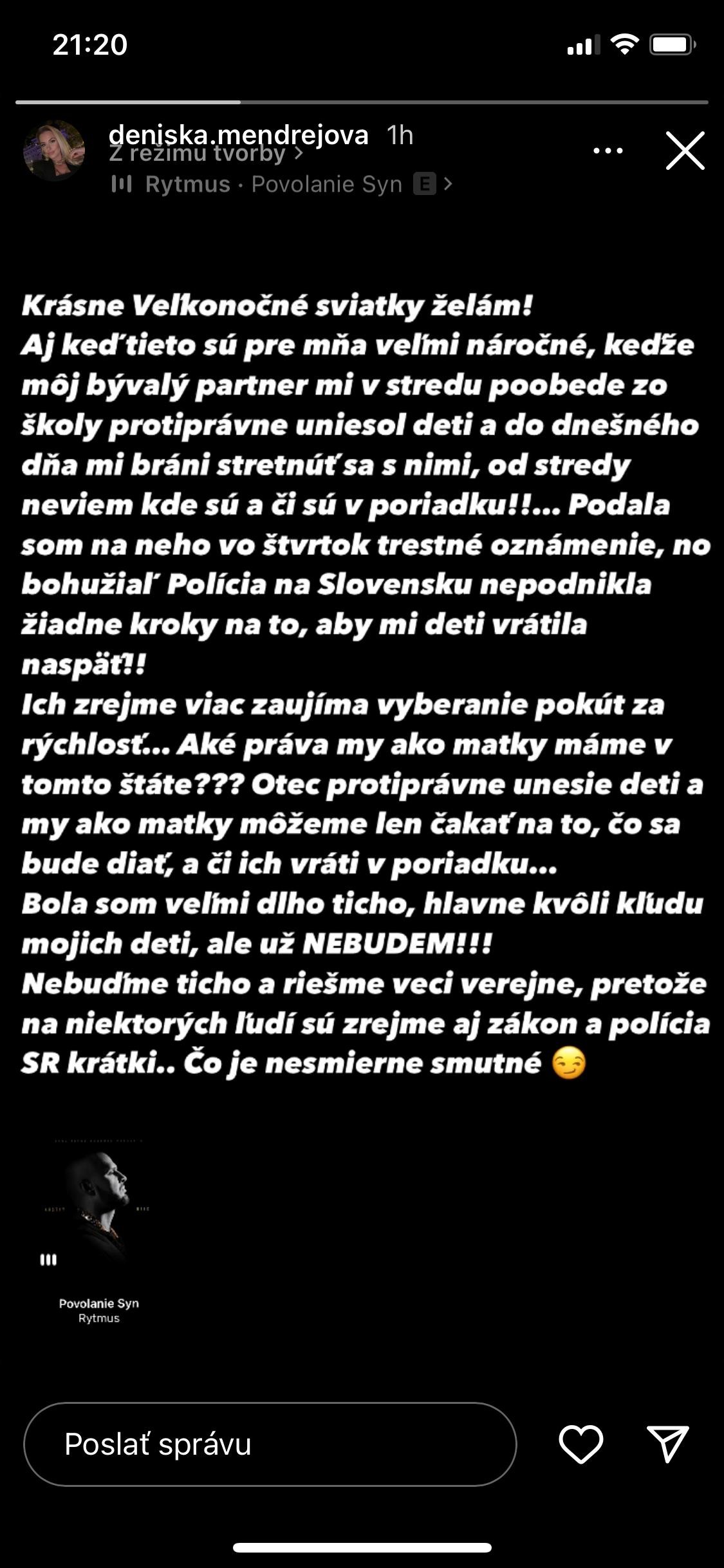 Iba matka vie, ako je to prežívať strach a bolesť, keď nevie, čo je s deťmi a kde sú. Tešila sa na spoločne prežité veľkonočné sviatky, no namiesto toho tŕpla úzkosťou a musela svoju situáciu riešiť s políciou, ale bezvýsledne. V nedeľu večer sa rozhodla so svojim trápením podeliť s jej sledovateľmi na Instagrame. "Prajem vám krásne veľkonočné sviatky! Aj keď tieto sú pre mňa veľmi náročné, pretože môj bývalý partner mi v stredu popoludní zo školy protiprávne uniesol deti a do dnešného dňa mi bráni stretnúť sa s nimi! Od stredy neviem, kde sú a či sú v poriadku. Vo štvrtok som na neho podala trestné oznámenie, ale, bohužiaľ, polícia na Slovensku nepodnikla žiadne kroky k tomu, aby deti vrátila späť! Zrejme ich viac zaujíma vyberanie pokút za rýchlosť... Aké práva máme my, ako matky, v tomto štáte?" opísala svoju nezávideniahodnú situáciu.